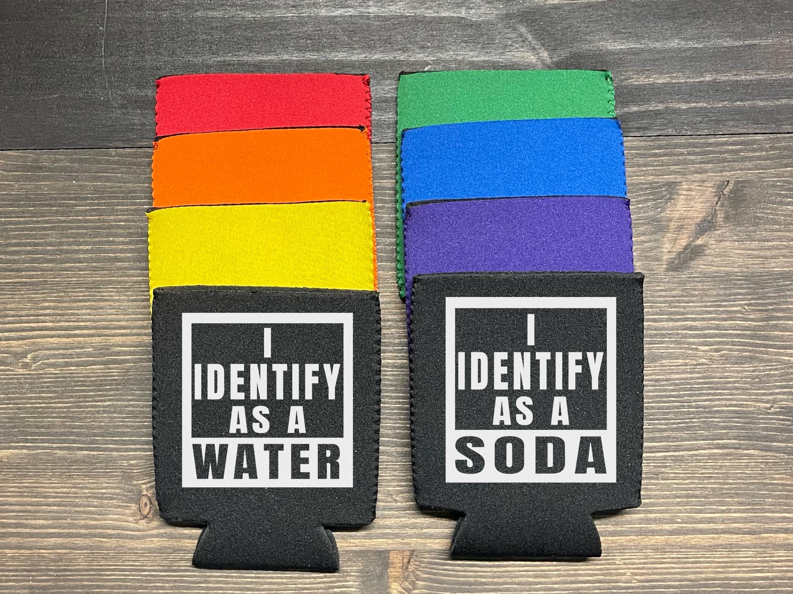 Funny Beer Coozies | Great Gag Gifts | Beer Can Cooler | I Identify as Water | Coozie Humor | Funny Coozies. Bulk pricing available.
